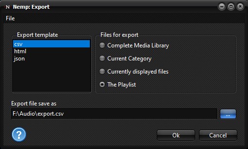 Nemp unterstützt für den Export nun ein rudimentäres Export-Vorlagen-System. Das bedeutet, dass Sie den Export Ihren Wünschen entsprechend anpassen können. Dabei können Sie sowohl steuern, welche Eigenschaften der Audiodateien exportiert werden sollen, als auch das Format wählen. Mitgeliefert werden drei Vorlagen für den Export als CSV-Datei, als JSON und ein eingeschränkter Export in Form einer HTML-Tabelle. Über das Menü können Sie die vorhandenen Vorlagen bearbeiten oder neue hinzufügen.