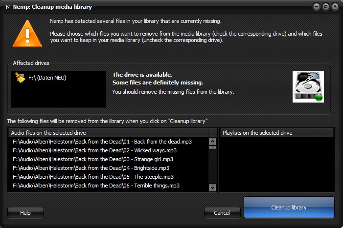 - Das Laufwerk ist vorhanden. Dann hat sich auf dem Laufwerk die Verzeichnisstruktur geändert, oder die Dateien wurden gelöscht. Tatsache ist, die Dateien sind nicht mehr da, wo Nemp sie beim Einlesen gefunden hat. Die Dateien sollten daher aus der Medienbibliothek entfernt werden.