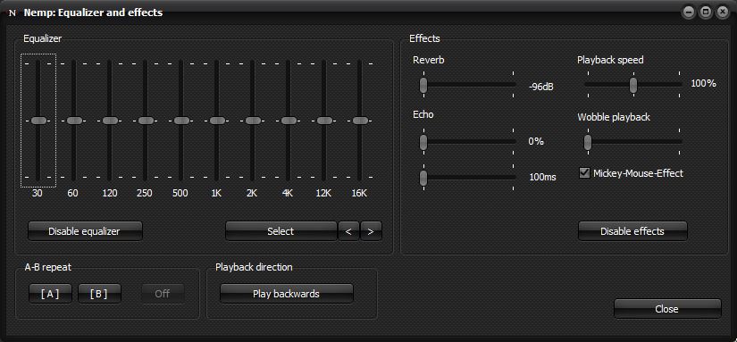 Nemp bietet einen Equalizer zum Anpassen der Wiedergabe, sowie ein paar Effekte. Viel mehr als eine Spielerei ist das aber nicht - audiophile Nutzer werden damit vermutlich keinen großen Spaß haben.