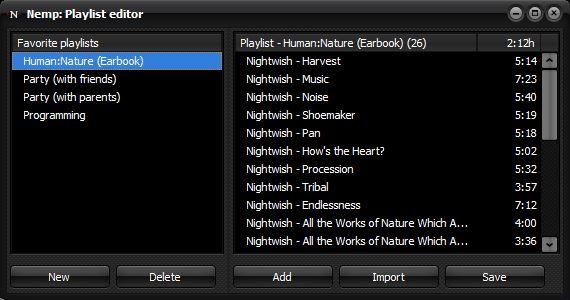 Seit Version 4.14 hat Nemp einen Schnellzugriff auf eine Liste von Favoriten-Playlists. Darüber kann schnell zwischen verschiedenen Playlists gewechselt werden, bei denen auch jeweils die Wiedergabeposition gespeichert wird. Zugriff auf die Favoriten erhält man über den Favoriten-Button im Kopfbereich der Playlist.
