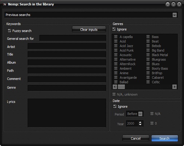 In den meisten Fällen reicht die Schnellsuche vollkommen aus. Nur in wenigen Fällen, z.B. bei der Suche nach einem bestimmten Liedtext, muss die ausführliche Suche herangezogen werden. Das war eine der ersten Funktionen in dem Ur-Nemp, das eigentlich nur eine mp3-Verwaltung war. Sie erreichen die Suche über das Menü oder die Tastenkombination Strg+Shift+F. In dem Suchfenster dann die gesuchten Begriffe eintragen und auf den Button Suchen klicken.