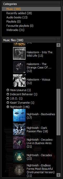 In Nemp 5 können in der Baumansicht mehrere Gruppierungen der Dateien gleichzeitig genutzt werden. Sie können also alle Dateien in der aktuell gewählten Kategorie getrennt nach Interpret und Album auflisten, und darunter - in einem weiteren Hauptzweig - eine Auflistung aller Verzeichnisse. Sie müssen also nicht mehr "umschalten", wenn Sie mal alle Lieder in einem bestimmten Verzeichnis hören wollen - Sie navigieren einfach in der Baumansicht im Hauptzweig "Verzeichnisse" zu dem gewünschten Ordner.