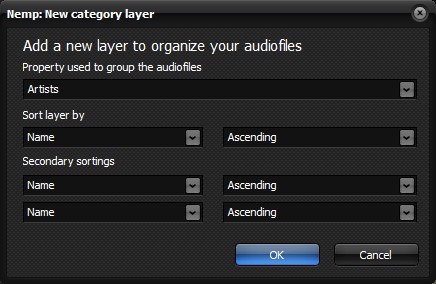 Beim Bearbeiten einer Ebene öffnet sich ein weiteres Dialogfenster, in dem Sie die Eigenschaften der Ebene festlegen können. Dazu gehört die Eigenschaft, nach der die Musikdateien gruppiert werden sollen, und wie diese Gruppierung sortiert werden sollen.