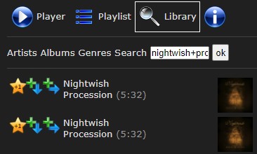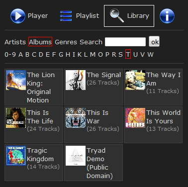 Sie können über den Webserver auch auf die Medienbibliothek zugreifen. Es steht eine Auflistung nach Interpreten, Alben, und Genres zur Verfügung. Einzeltitel können über die Suche gefunden werden, die wie die Schnellsuche in Nemp funktioniert, inklusive Fehlertoleranz.