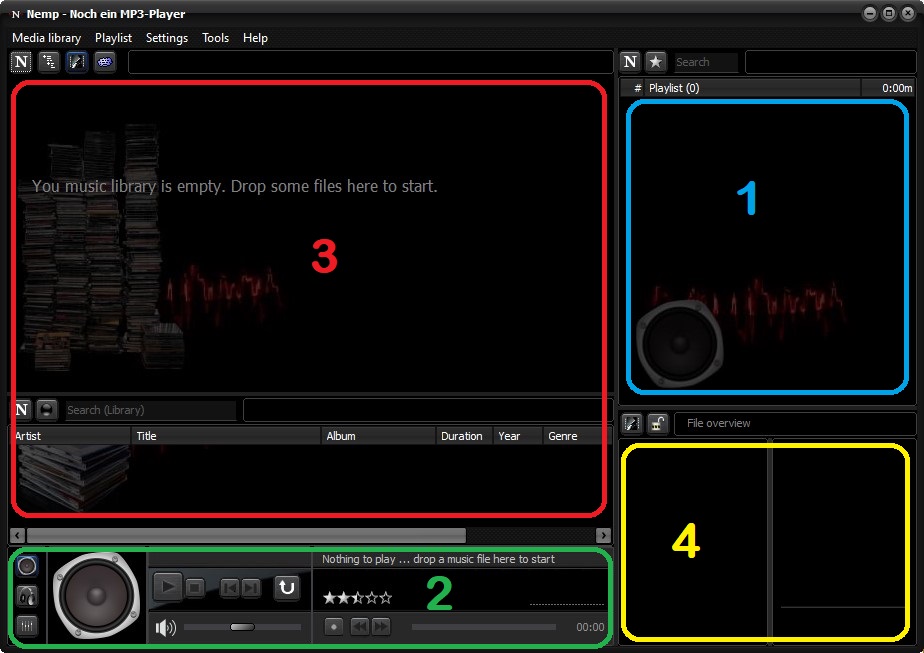 When you have completed the settings wizard, you can start playing music and building the media library. The main window of Nemp consists of several parts. At the beginning, i.e. when the playlist and media library are empty, some hints are visible to make it a bit easier to get started.