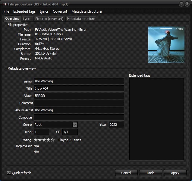 On the first page "Overview" you get an overview of the metadata for the selected title. You can edit the usual properties like artist, title, album and some more here. The changes are then also written to the file's metadata. You cannot edit the play counter directly. However, you can reset the rating and replay counter to 0 ("0" for the rating corresponds to a "neutral" rating of 2.5 stars). The ReplayGain values are also only displayed there. However, manually entering these values doesn't make sense either.