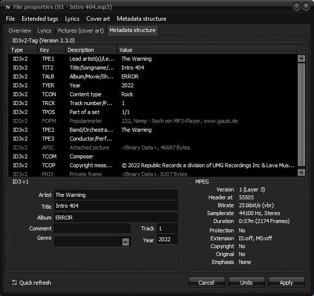 For more detailed editing of the metadata, Nemp has a details window that can be opened with the key combination Ctrl+D when a track is highlighted in the media library or playlist. Here, in addition to making specific changes to the ID3 tags, other information can be accessed that may not be of great interest, but some may find useful.