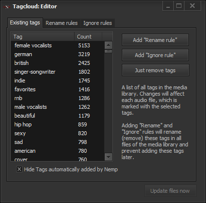 In the first tab existing tags you will find a listing of all, really all tags in the media library, from frequent like singer-songwriter to exotic like songs die so gut sind das ich meiner oma ihr klein haeuschen zwar nicht verkaufen aber zumindest dafuer beleihen wuerde, with which actually some titles at last.fm are tagged. (The long tag translates to: songs that are so good that I wouldn't sell my grandmother’s little cottage for it, but at least I would lend it)